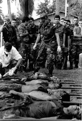 Cinco guerrilleros del ELN matados por el ejército. Después de la batalla los cuerpos fueron llevados por avión a una base del ejército para ser expuestos ante los soldados y la prensa.